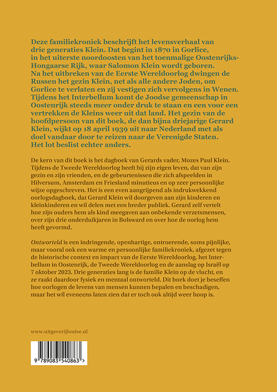 Ontworteld is een indringende, openhartige, ontroerende, soms pijnlijke, maar vooral ook een warme en persoonlijke familiekroniek, afgezet tegen de historische context en impact van de Eerste Wereldoorlog, het Interbellum in Oostenrijk, de Tweede Wereldoorlog en de aanslag op Israël op 7 oktober 2023. Drie generaties lang is de familie Klein op de vlucht, en ze raakt daardoor fysiek en mentaal ontworteld. Dit boek doet je beseffen hoe oorlogen de levens van mensen kunnen bepalen en beschadigen, maar het wil eveneens laten zien dat er toch ook altijd weer hoop is.