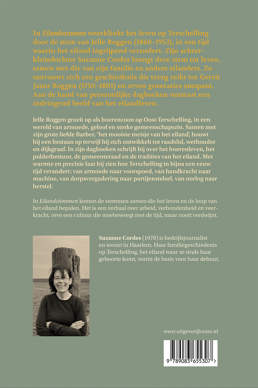 In Eilandstemmen weerklinkt het leven op Terschelling door de stem van Jelle Roggen (1860–1953), in een tijd waarin het eiland ingrijpend verandert. Zijn achterkleindochter Suzanne Cordes brengt deze stem tot leven, samen met die van zijn familie en andere eilanders. Zo ontvouwt zich een geschiedenis die terug reikt tot Gerrit Jansz Roggen (1750–1801) en zeven generaties omspant.Aan de hand van persoonlijke dagboeken ontstaat een indringend beeld van het eilandleven.